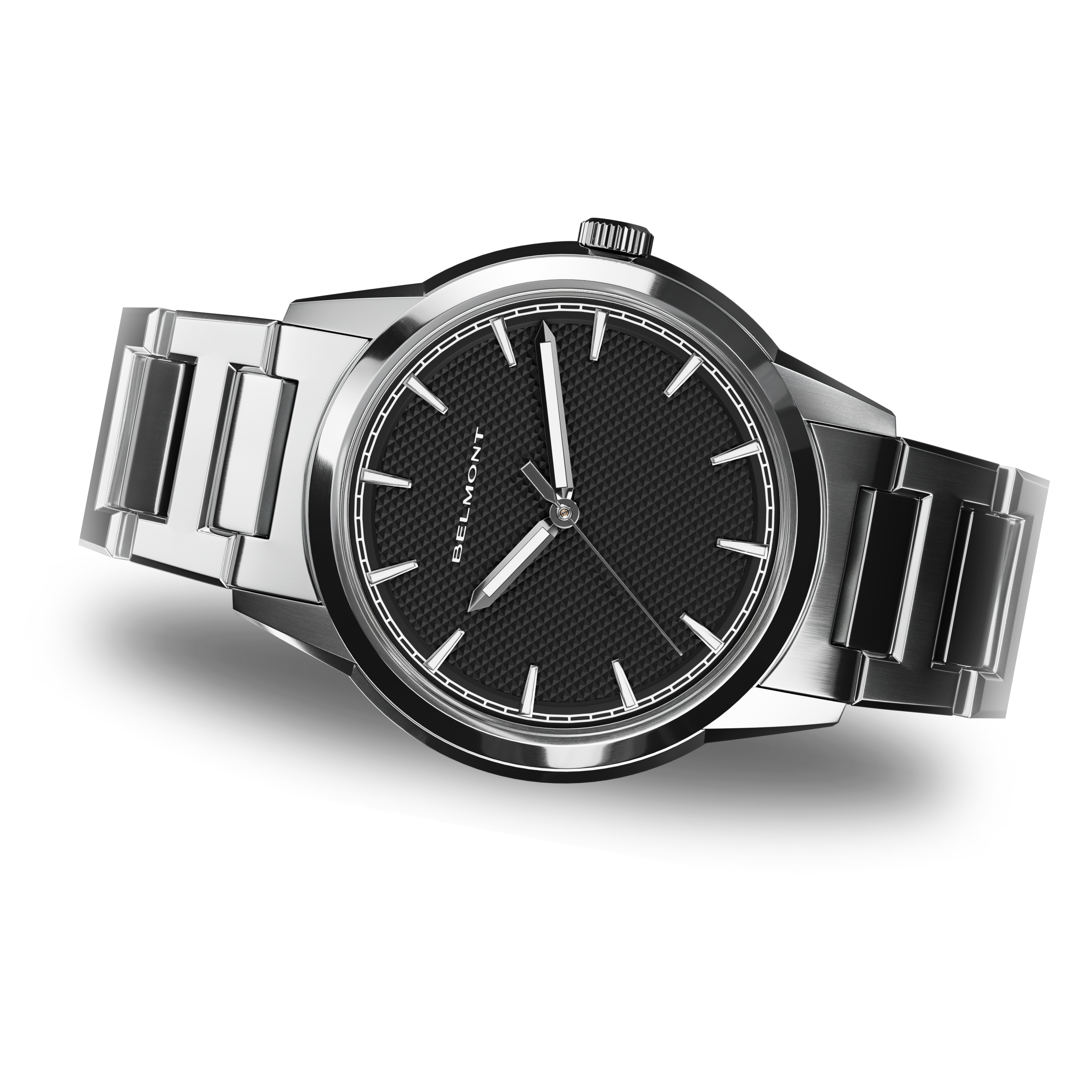The Vanquish captivates with its carbon geometric patterned dial, a sophisticated design accentuated by luminous applied stainless steel hour indexes.