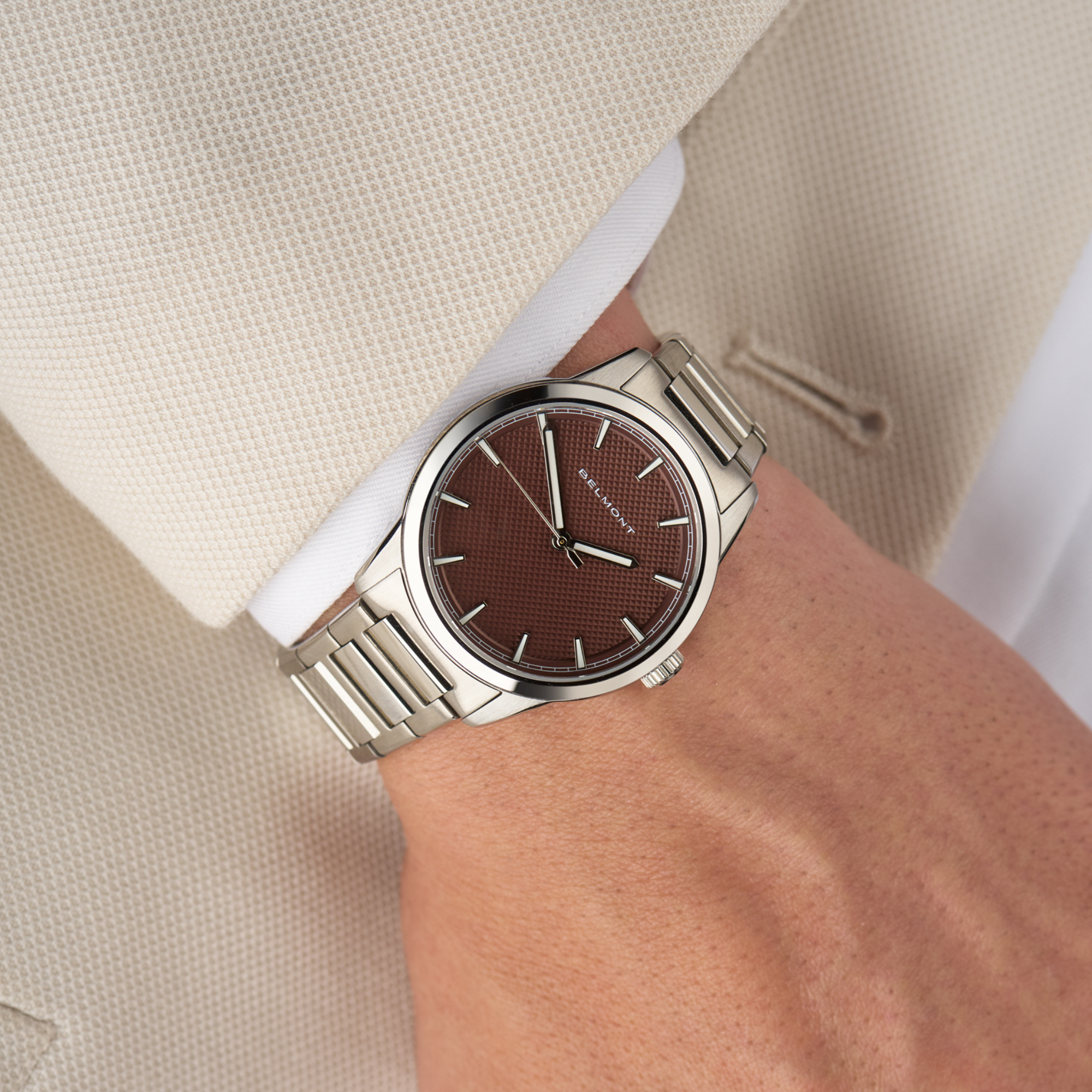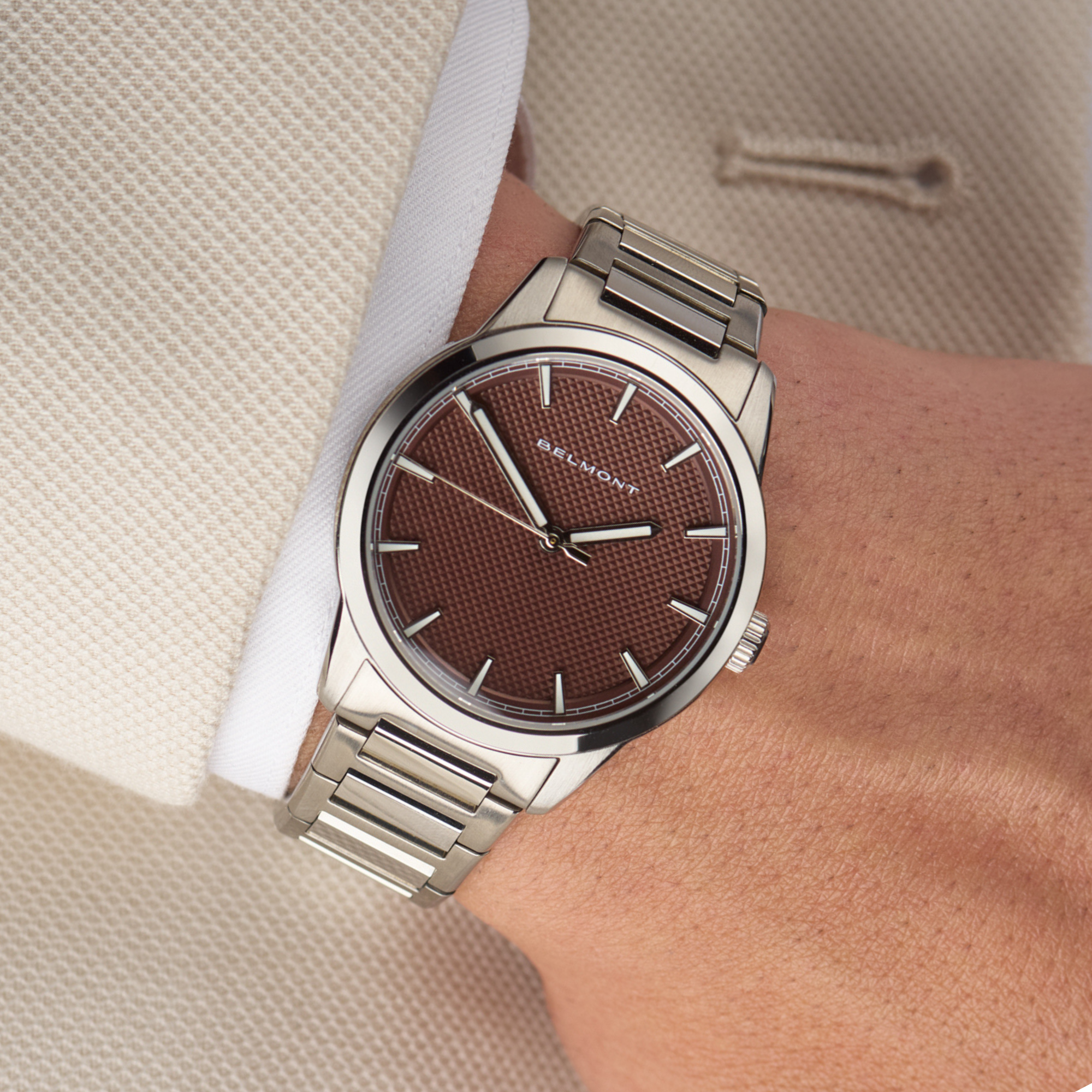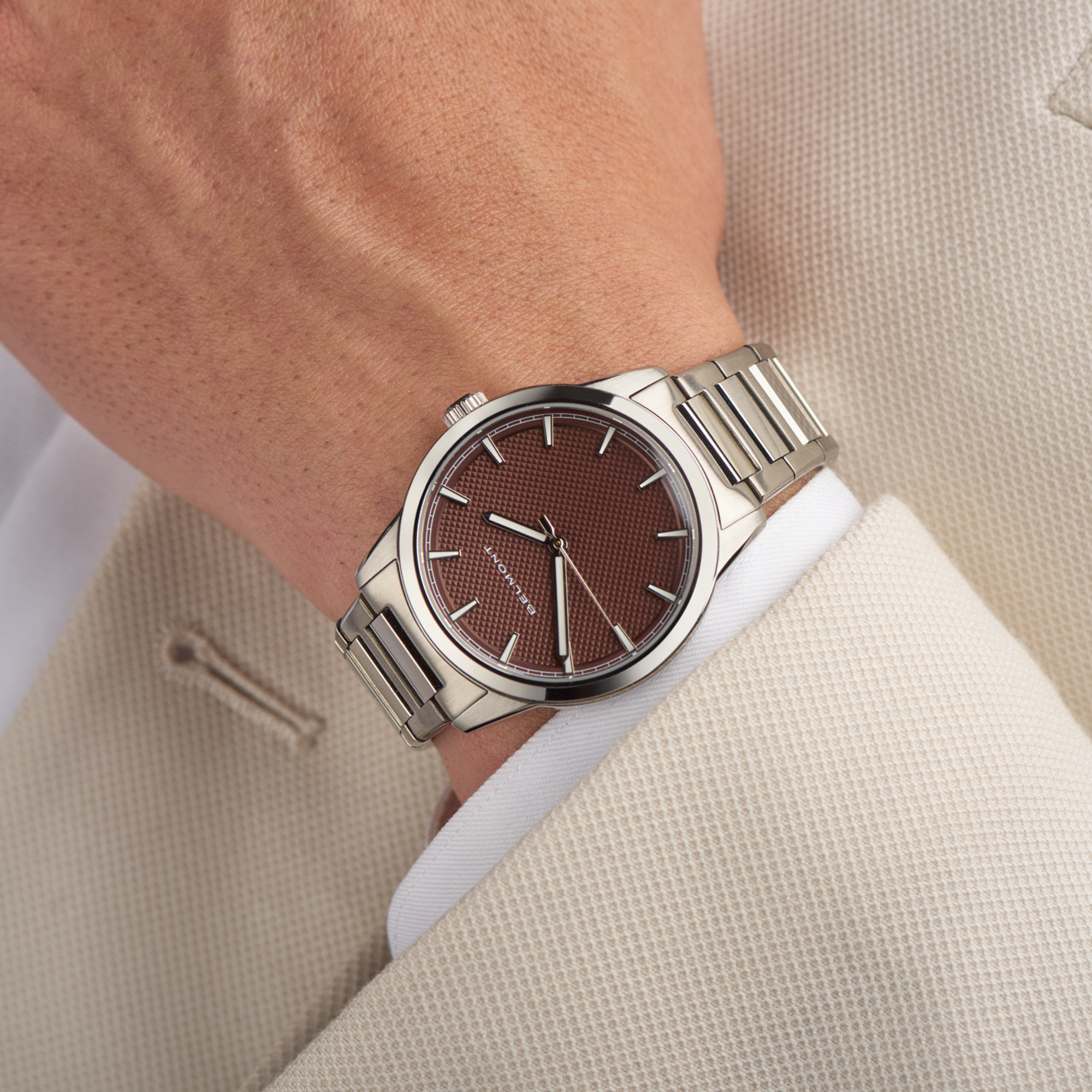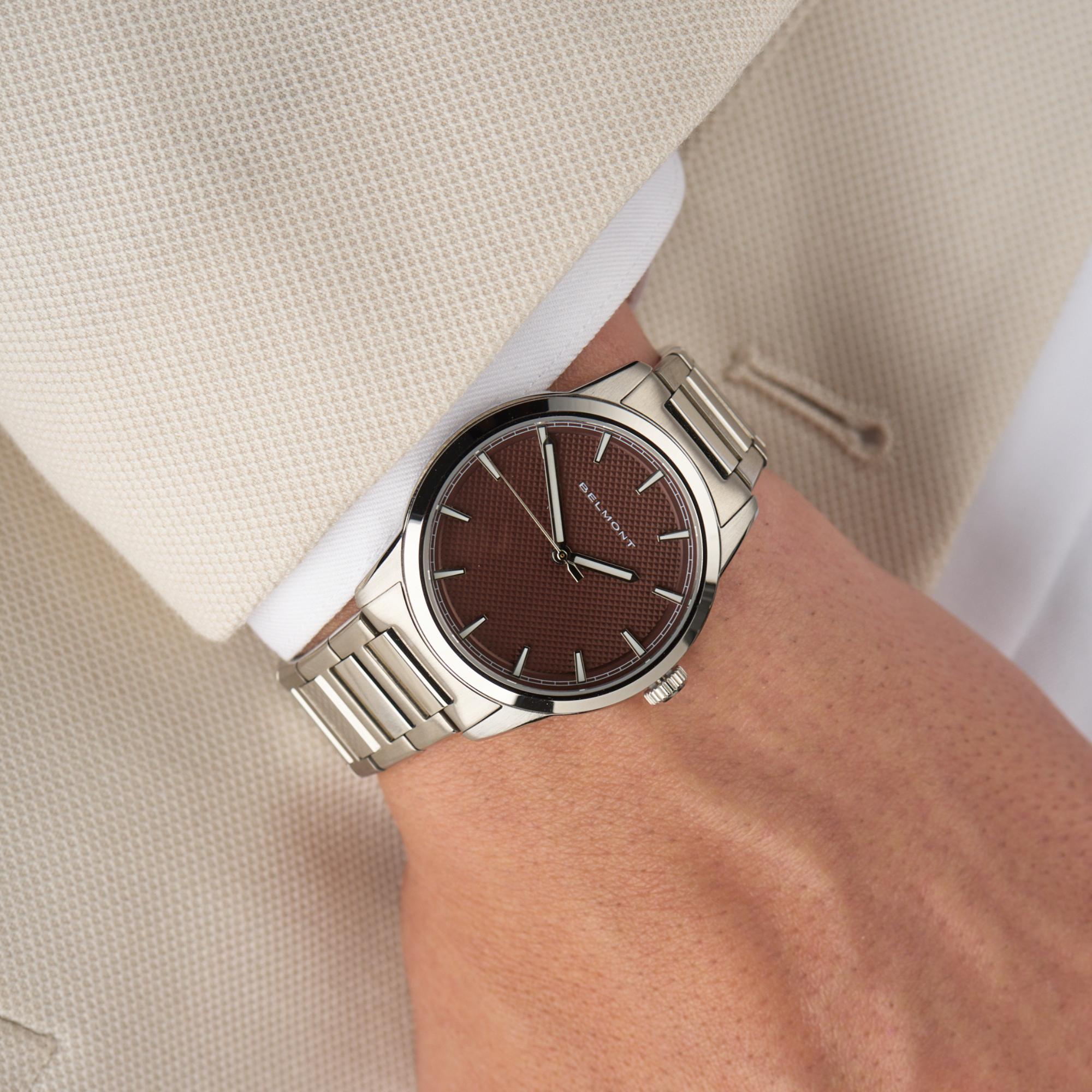 The Vanquish captivates with its brown geometric patterned dial, a sophisticated design accentuated by luminous applied stainless steel hour indexes.